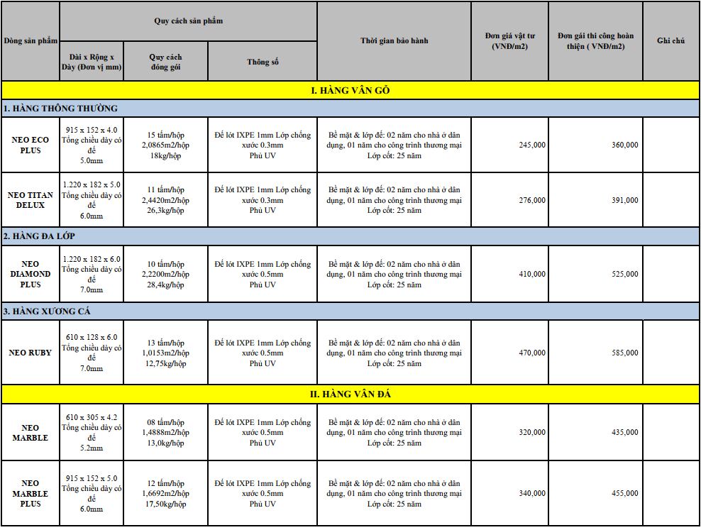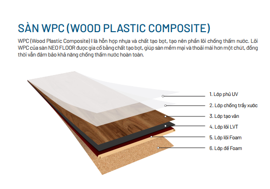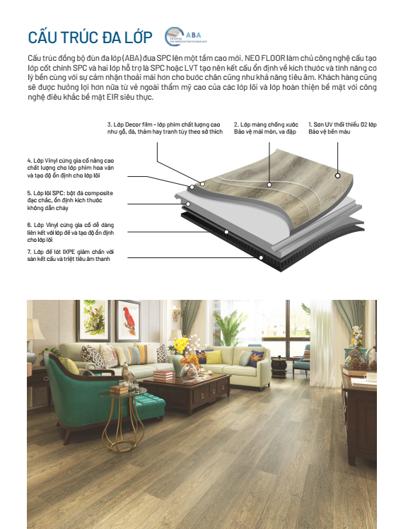 • NEO FLOOR sử dụng công nghệ cấu tạo lớp lõi cốt chính SPC hoặc lõi hỗ trợ là SPC hoặc LVT.