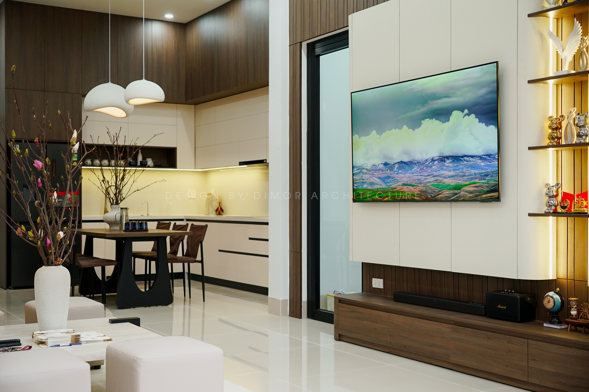 TV được treo trên vách ốp sáng màu, nổi bật trên nền gỗ tối phía sau. Hệ tủ dưới màu gỗ sẫm chạy dài, giúp lưu trữ gọn gàng và tạo sự vững chãi cho không gian.