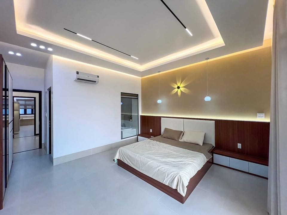 Không gian phòng ngủ Master rộng rãi với lối thiết kế hiện đại, tập trung vào mảng khối phẳng và sự tối giản. Vách ốp đầu giường được thiết kế theo phong cách hiện đại và sang trọng với sự kết hợp hài hòa giữa vật liệu và ánh sáng hiện đại.