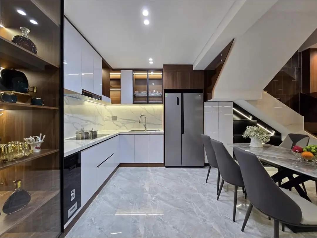 Không gian bếp và khu vực ăn uống được thiết kế tối ưu hóa diện tích nhưng vẫn giữ được vẻ sang trọng và tiện nghi. Thiết kế chữ L tận dụng tối đa góc nhà, tạo nên một không gian đầy tiện nghi và thoáng đãng.