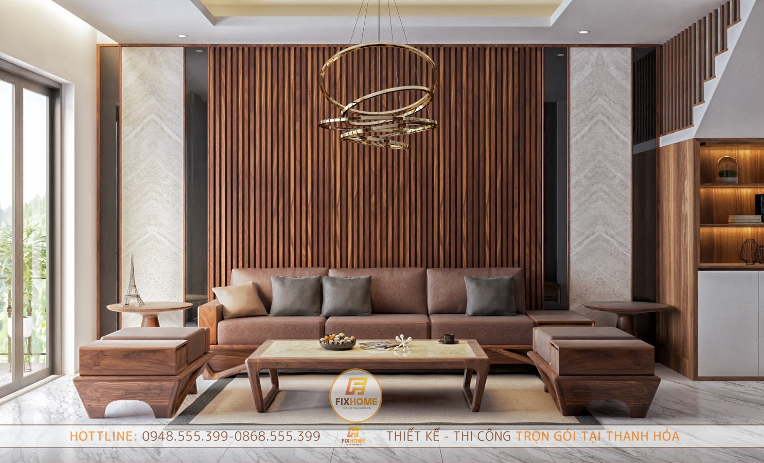 Bộ Sofa với tone màu nâu vân gỗ hài hòa với không gian phòng