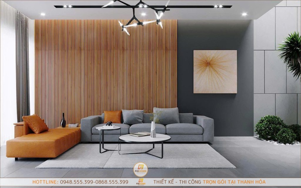 Đối với mẫu thiết kế phòng khách này, FixHome Thanh Hóa lựa chọn chiếc ghế sofa màu xám kết hợp với màu nâu, với không gian mang tone xám trắng của cả căn nhà để tạo sự hòa quyện thống nhất cho tổng thể, đem lại một không gian sống hài hòa, ấm cúng cho các thành viên trong gia đình. Chiếc bàn tròn mặt kính sang trọng giữa căn phòng được xem là một điểm nhấn.