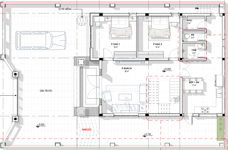 Khu vực sân vườn: Phía trước là một khoảng sân trước rộng rãi dùng để đỗ xe ô tô, có vị trí giếng trời và lối đi ram dốc dành cho xe vào nhà. Xung quanh nhà được bố trí dải cây xanh tạo cảnh quan.